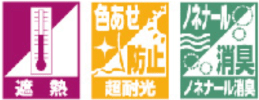 省エネ対策品・超耐光商品など、機能性商品の充実、遮光カーテンに遮熱機能を持たせた「アルミコーティング加工」を採用。シィアーには遮熱効果のある原糸「ルミポール」「涼しや(R)」を採用し節電効果に交換します。